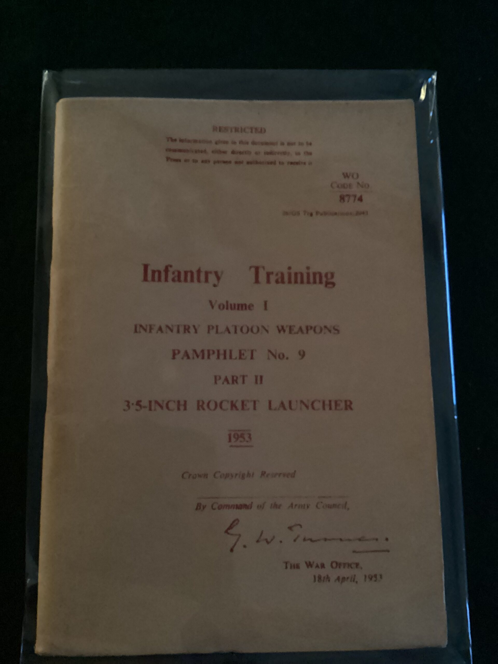Infantry 3.5- inch Bazooka pamphlet 1953 Original Infantry Training pamphlet no9. The 3.5inch Rocket Launcher . Dated 1953. By Command of the Army Council, The War Office 18th April 1953. In vgc.