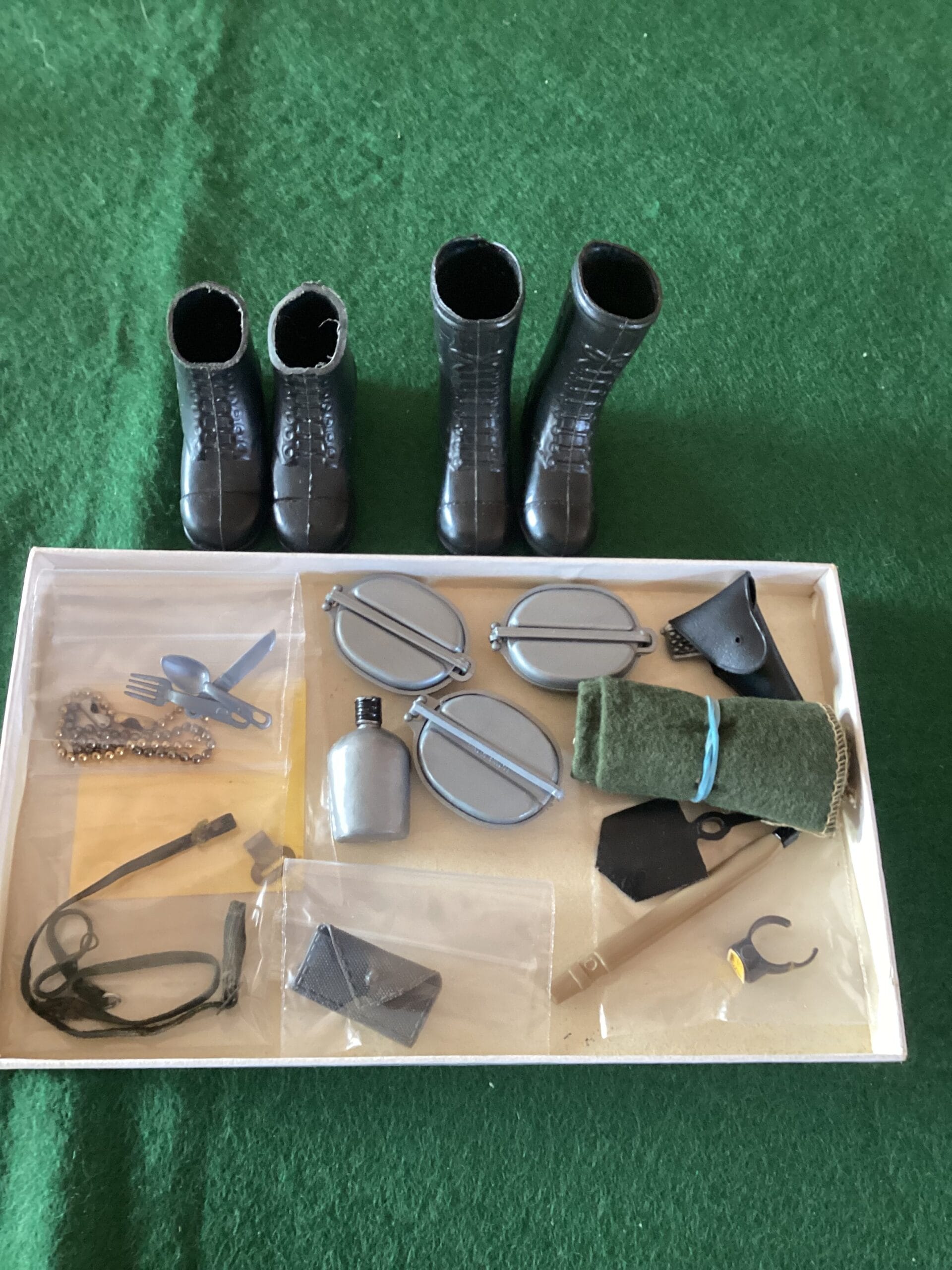 Vintage Action Man accessories. boots x 2 , 3 x mess kits American, blanket, entrenching tool, rifle sling, pouch, knife fork spoon. divers watch. pistol and holster(different maker). first aid crutch. action man manual (no cover)