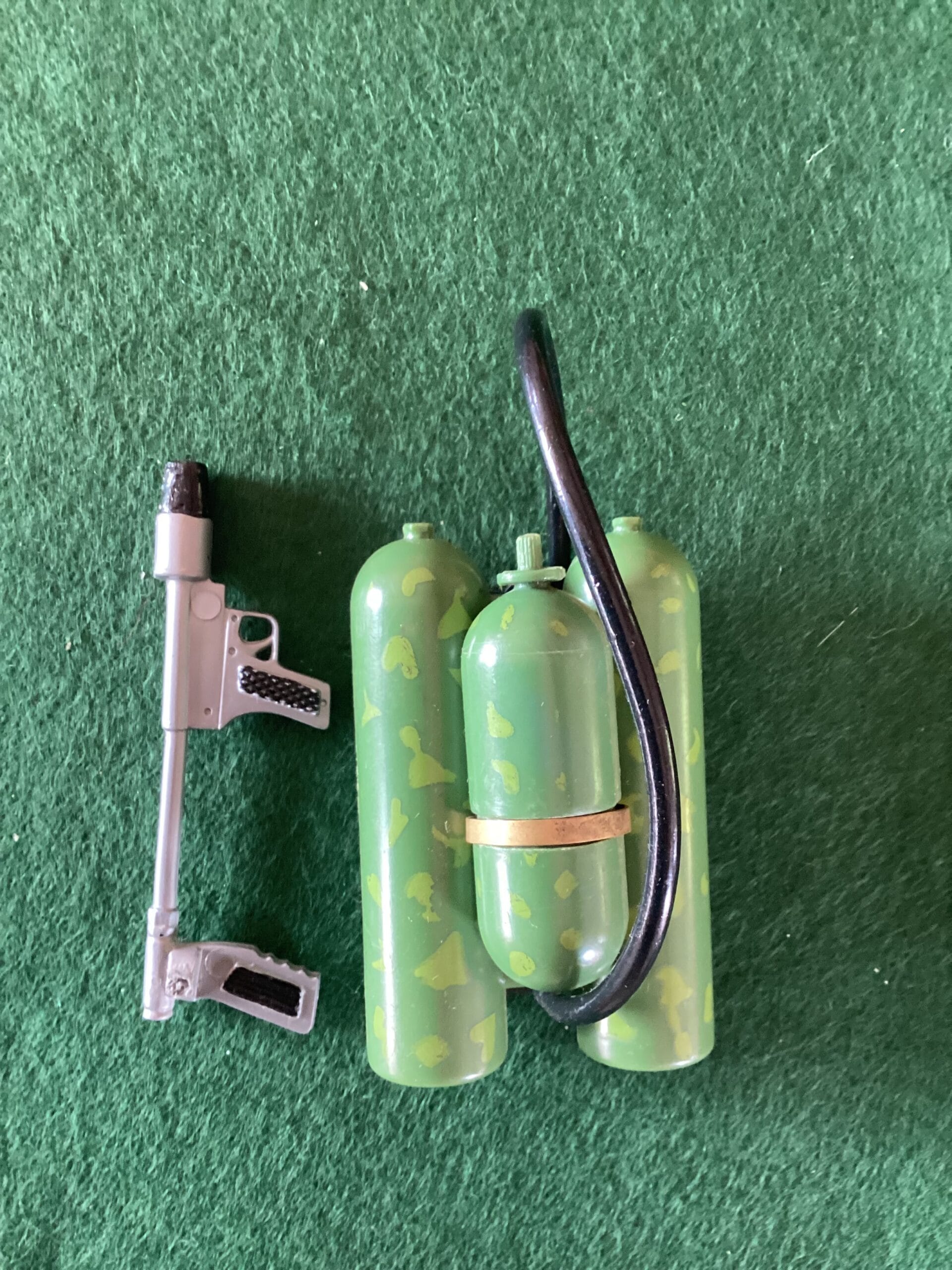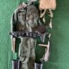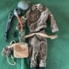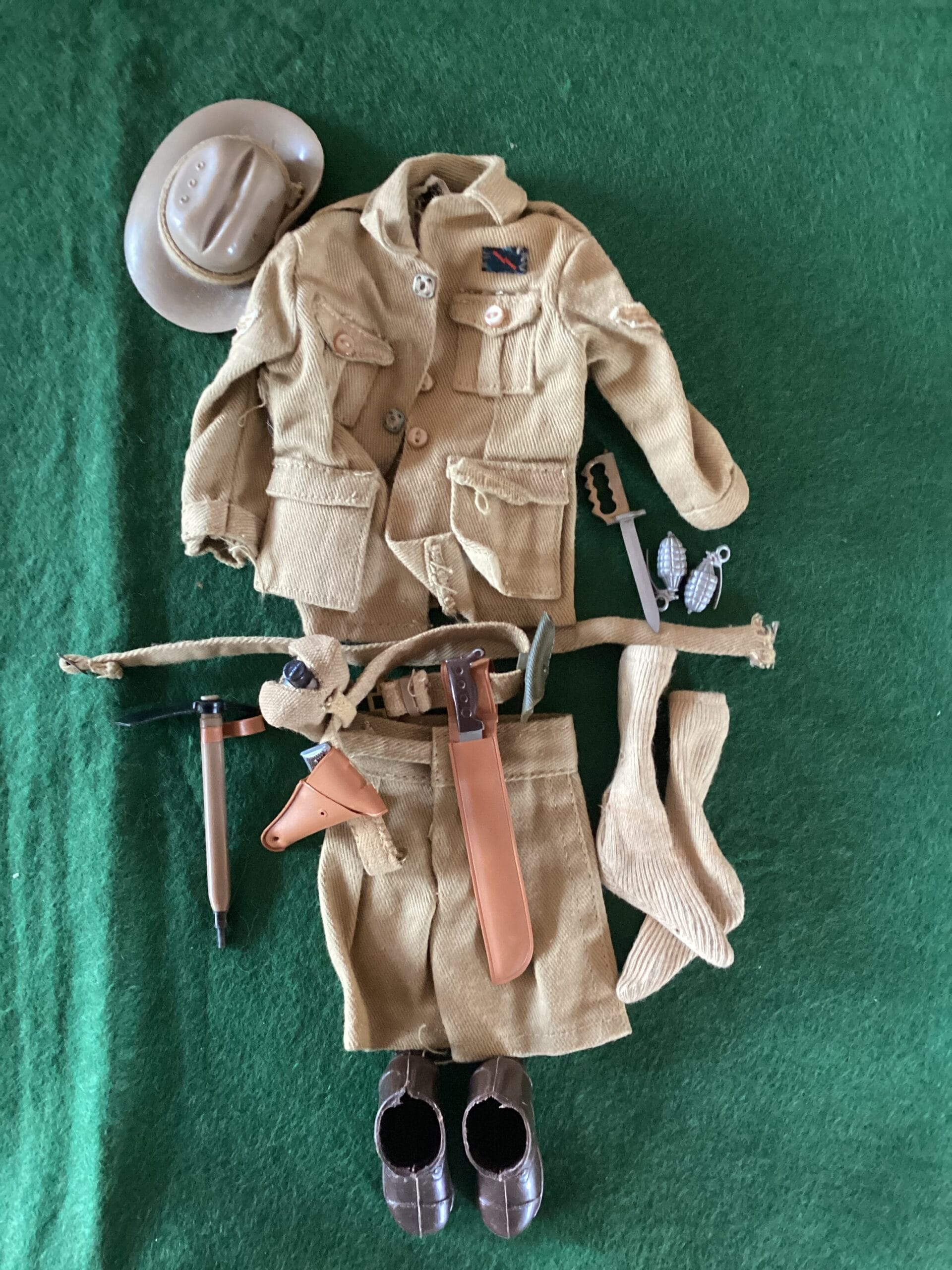 Vintage Action man Australian Infantryman Uniform, 1960’s early issue set. VGC jacket and shorts, campaign hat, high socks (pair), bush machete, sheath, boots, entrenching tool, grenades x2, flame thrower ( gun detached from the tube)