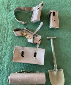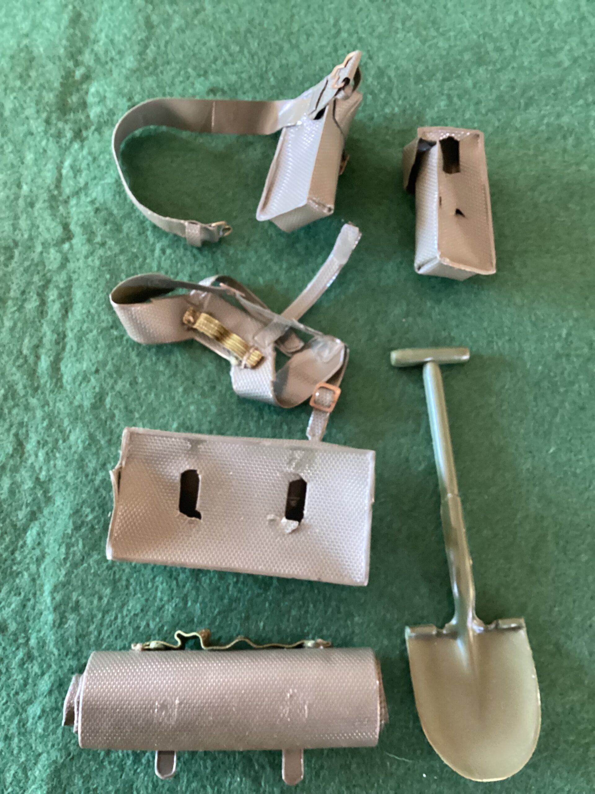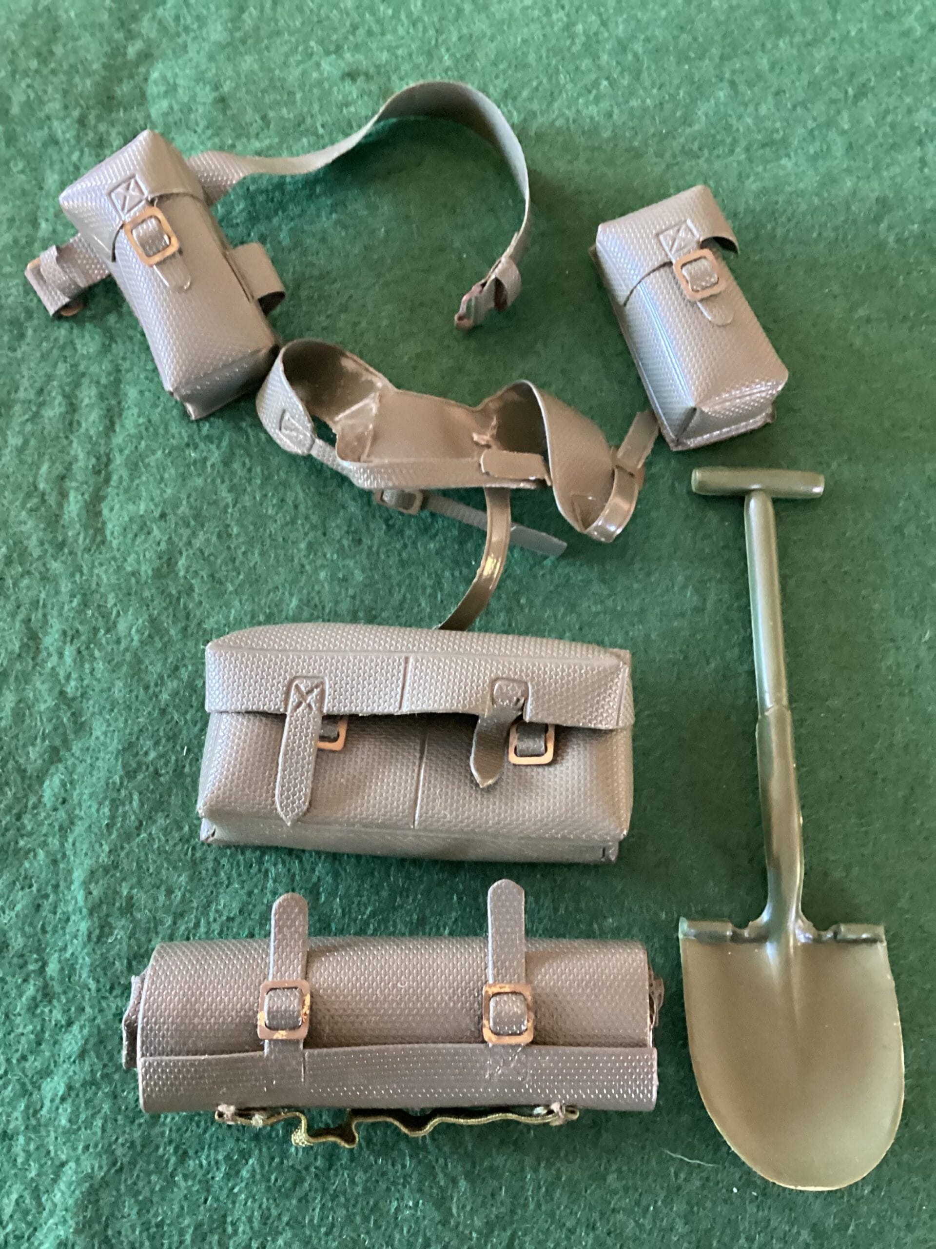 back pouches, ammo pouches and belt, remains of webbing harness. These items are all play worn.