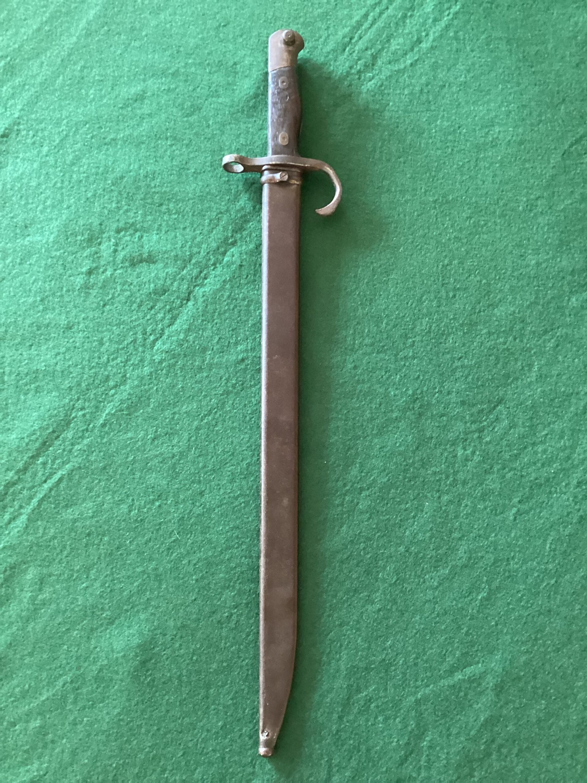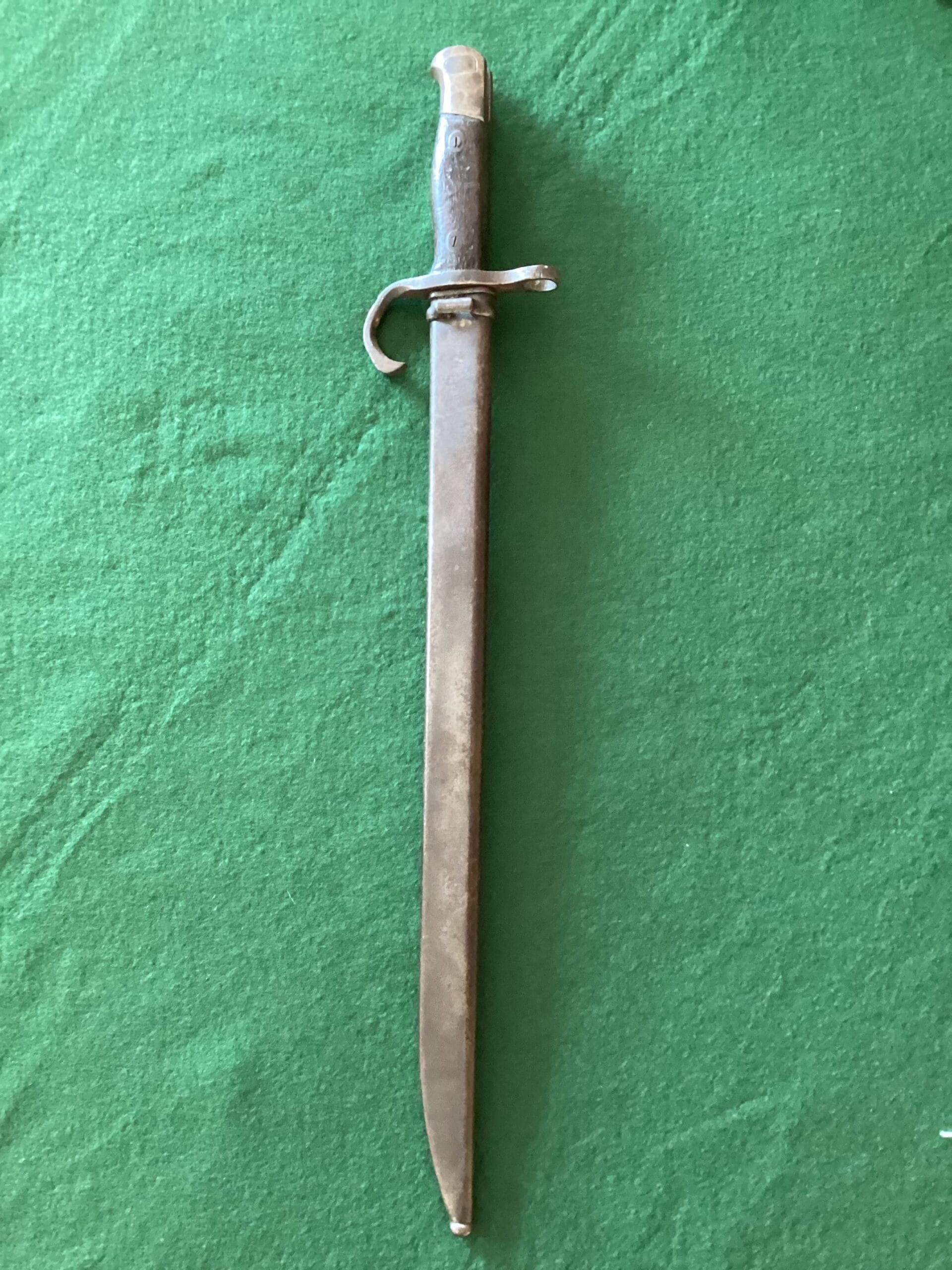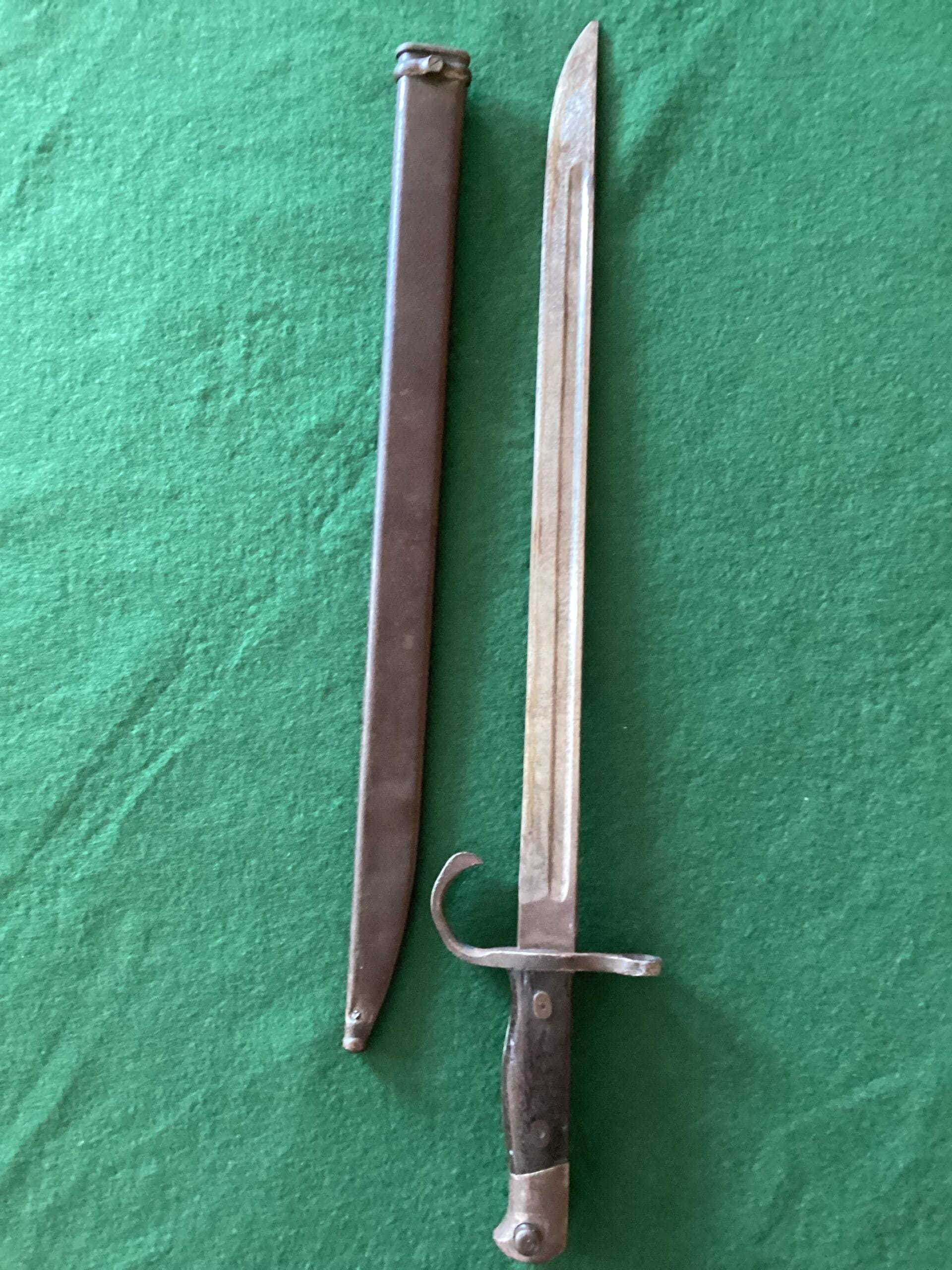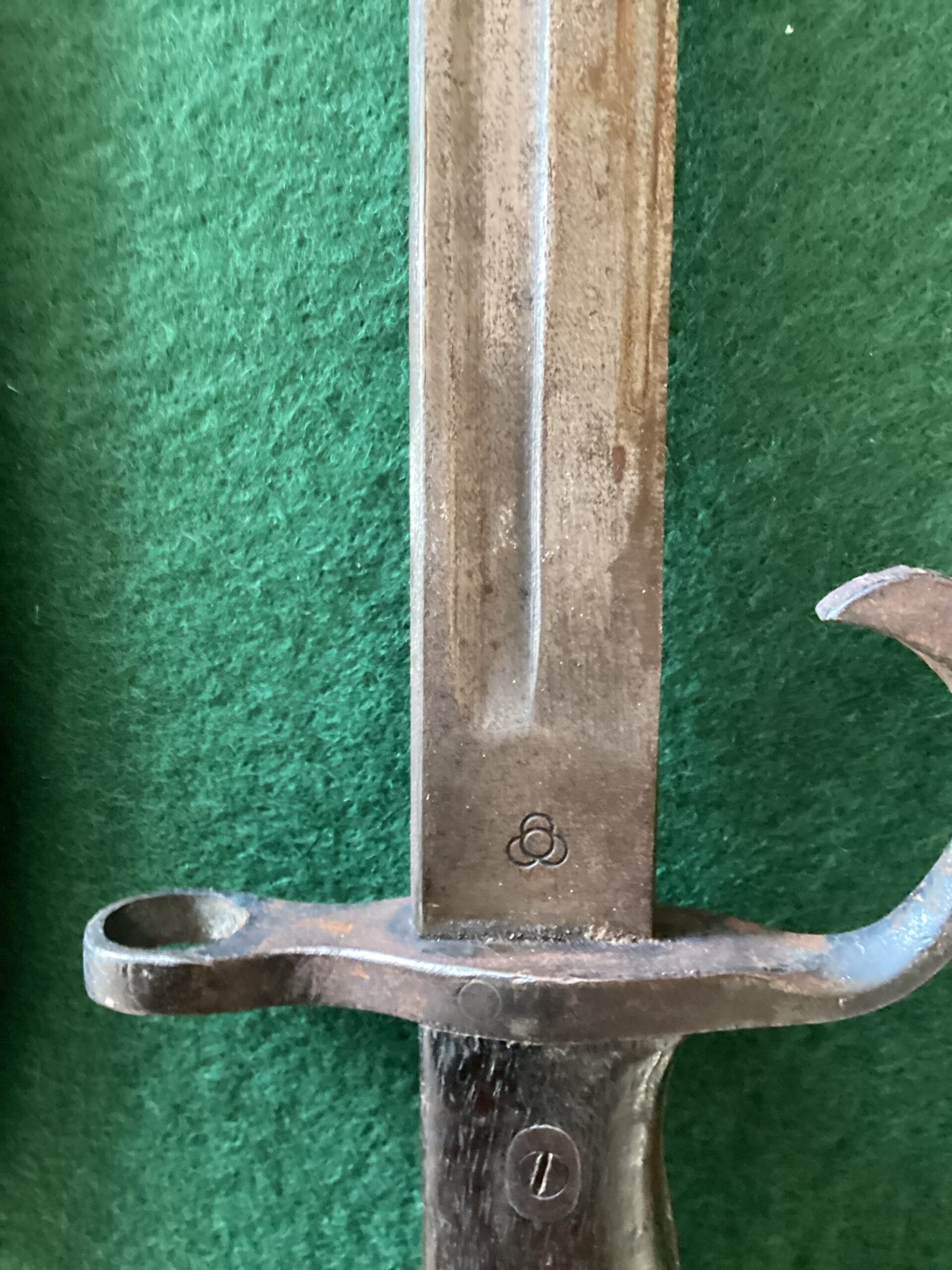 WW2 Arisaka Bayonet (Type 30) with hooked quillon. Early production type 30 (1897) bayonet. It has a rounded pommel, shaped grips and a hooked quillon. This type of bayonet served the Japanese Army until the end of WW2. Maker: The Kokura Arsenal.